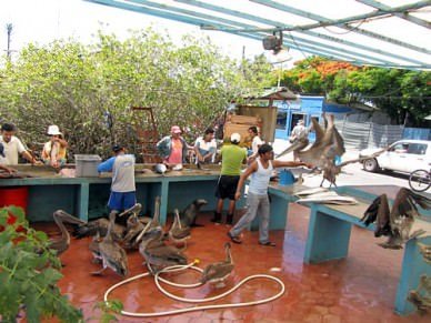 Seals and pelicans at the fishermen’s cleaning station.